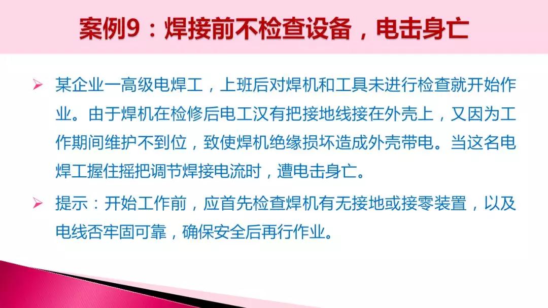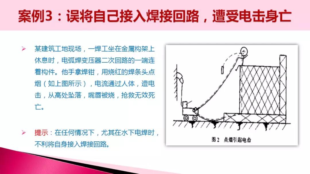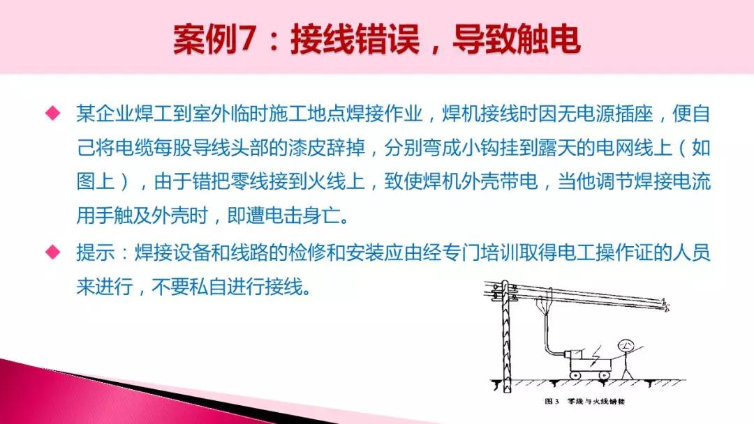 焊工不熟悉相關的電氣安全知識,錯將零線接到火線上,導致焊機外殼帶電,導致觸電身亡。