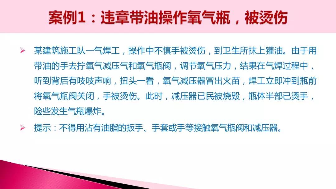 某個建筑工隊的氣焊工在進行焊接作業(yè),使用漏氣的焊炬,焊工的手心被調節(jié)輪處冒出的火炬苗燒傷起泡,涂上獾油后繼續(xù)進行作業(yè),施焊過程中又一次發(fā)生回火,氧氣膠管爆炸,減壓器著火并燒毀,關閉氧氣瓶閥門時,氧氣瓶上半截已非常燙手,非常危險。
