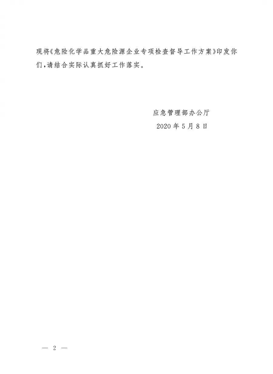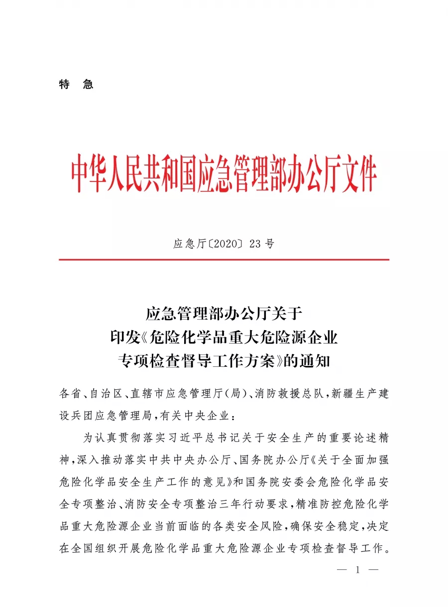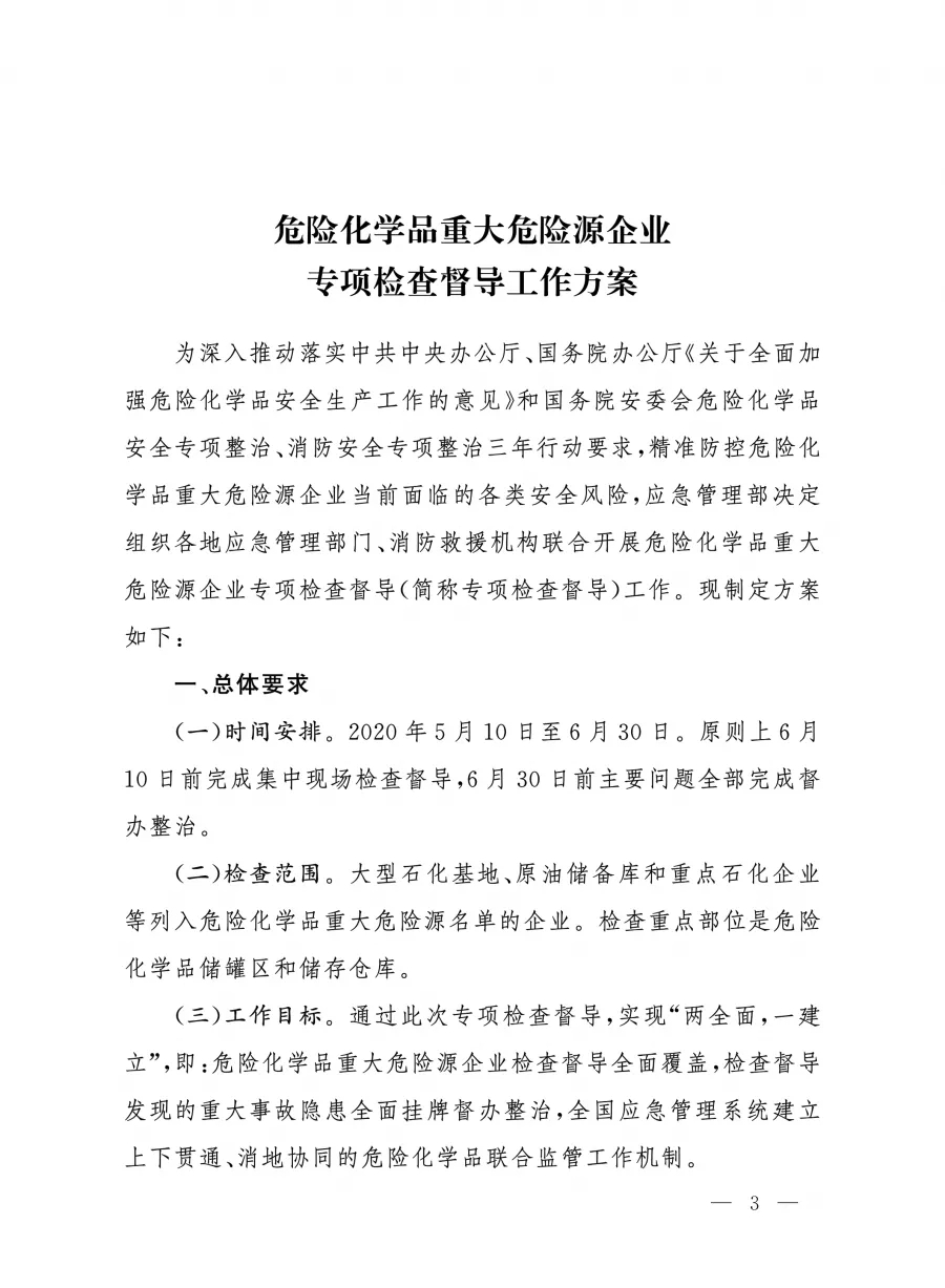 應急廳〔2020〕23號 危險化學品重大危險源企業專項檢查督導工作方案 |