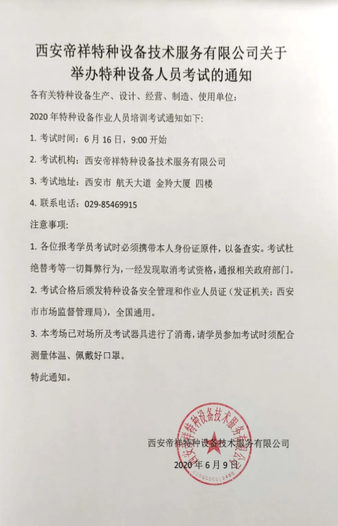 西安帝祥特種設備技術服務有限公司根據通知精神,為給考生提供安全、清潔的考場環境,本考點做了大量準備工作,對考場進行全面消殺,做好室內通風,保證考場符合良好的衛生要求。決定于2020年6月16日舉辦特種設備人員考試工作。