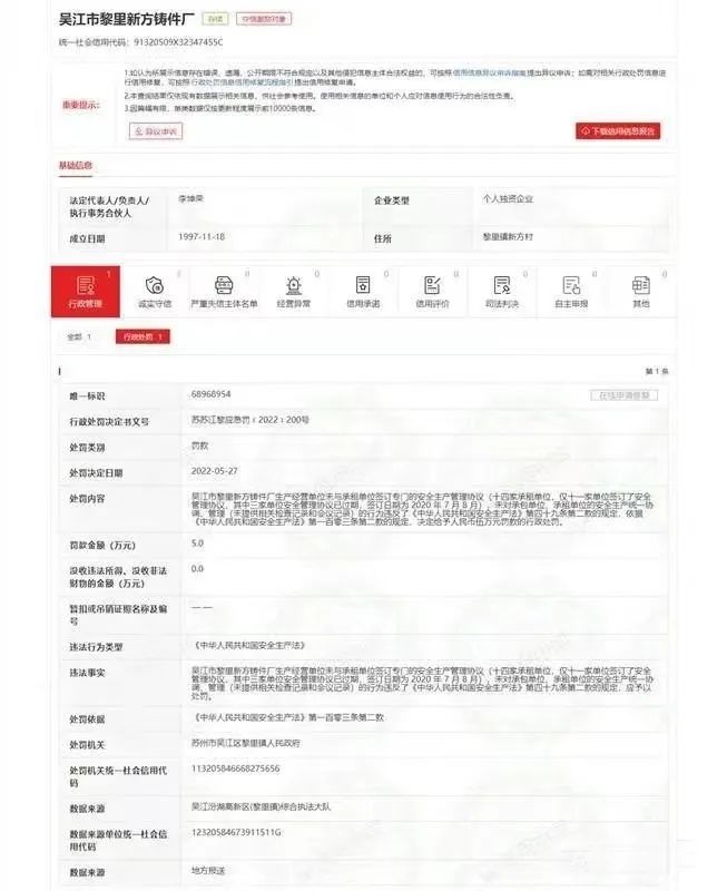 最新案例:2022年5月27日,蘇州市吳江區黎里鎮人民政府作出蘇蘇江黎應急罰﹝2022﹞200號處罰決定書,吳江市黎里新方鑄件廠違反了《中華人民共和國安全生產法》第四十九條第二款的規定,依據《中華人民共和國安全生產法》第一百零三條第二款,給予吳江市黎里新方鑄件廠罰款人民幣5.0萬元的行政處罰。